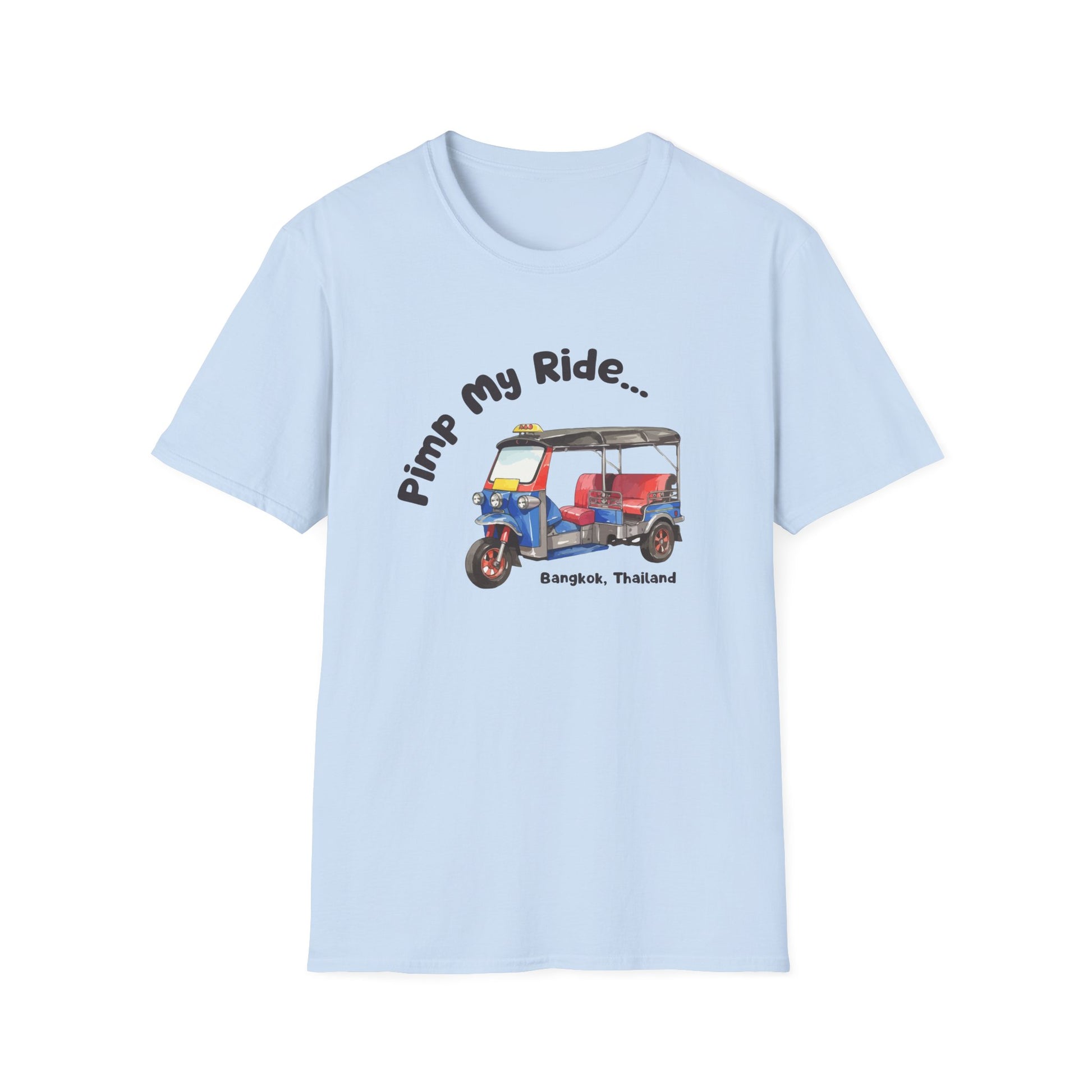 Light, breathable, and quietly cheerful — this softstyle tee carries a hand-painted tuk-tuk illustration and the playful line “Pimp My Ride... Bangkok, Thailand.” It settles into warm-weather days and travel memories alike: the colors read like a sunlit street market, the relaxed crew silhouette layers easily under a jacket or over a tank. Wear it while wandering city lanes, nursing jet lag at a sidewalk café, or telling travel stories with friends. The shirt feels lived-in from the first wear, with a smooth print that keeps its character through washes and a tear-away label for comfort.